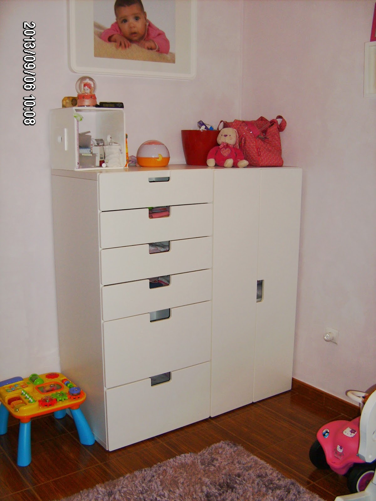 No chão tem a mesinha de actividades, oferta da amiga Marisa, que a V gosta muito de colocar a música a tocar. A seguir tem os armários, um com gavetas e o outro com o roupeiro. Em cima dele, a malinha dela, o ruca (coelho peluche), um recipiente com os cremes e o modulo onde colocamos os cotonetes, charopes e perfumes. Por cima deste modulo tem uma caixinha de musica, oferta da prima Sandra. Na parede, por cima do roupeiro e comoda tem um quadro já com a foto da V com 3 meses de idade.